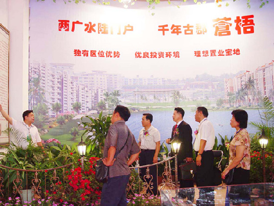 ??? 展廳內展出的全縣經濟規劃、發展成就、合作項目引起來賓的濃厚興趣,他們紛紛駐足詢問相關情況。整個主展廳布置得流光溢彩、令人目不暇接。四周是我縣“十五”規劃重點發展的經濟形象展,旅游、農業、工業等特色及高科技產業展均在其中。梧州市時任副市長竺坤松、楊錦萍在縣有關領導的陪同下參觀展廳,他們對展廳內極具特色的產品圖片展表現出了濃厚的興趣。