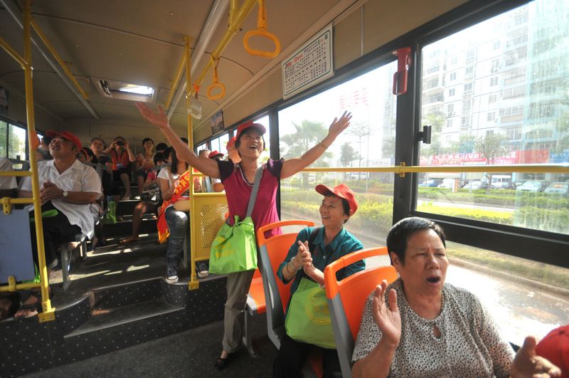 ????昨日,旅游車特意慢慢地行駛在市內(nèi)的道路上,好讓社區(qū)解說員小李為老人們講述沿途建筑物的新變化。為了使氣氛不至于太過沉悶,有人提議“唱歌前行”。曾群英婆婆首先響應(yīng),聲情并茂地唱了一首老紅歌。在曾群英的領(lǐng)唱下,大伙心情激昂地唱起了歌曲“沒有共產(chǎn)黨就沒有新中國”。解說員小李也受到感染,為了應(yīng)節(jié),唱了一首“九月九的酒”,樂得老人們喜上眉梢,拍手稱好。