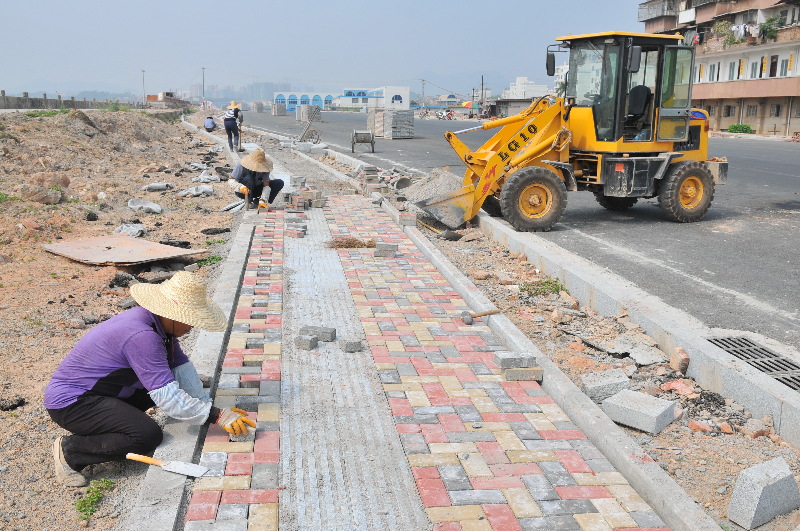 ????目前,紅嶺三號路(東段)400多米的道路已基本完成了柏油路面的鋪設,目前施工隊伍正在建設兩旁人行道的路基,工人在部分已做好了路基的人行道上鋪設新的地磚,沿江邊的觀景平臺也在緊張施工中。 李鴻榮 攝