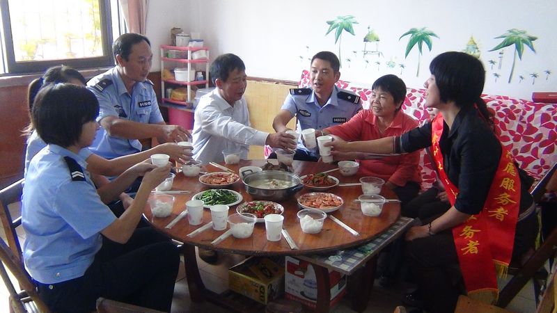 交警大隊(duì)的志愿者們還帶著自己買過(guò)來(lái)的食材大顯身手,為陳婆婆煮了雞、蝦、魚等一共五菜一湯。飯菜煮熟后,一行10人滿滿圍成一大桌和陳婆婆一起吃飯。