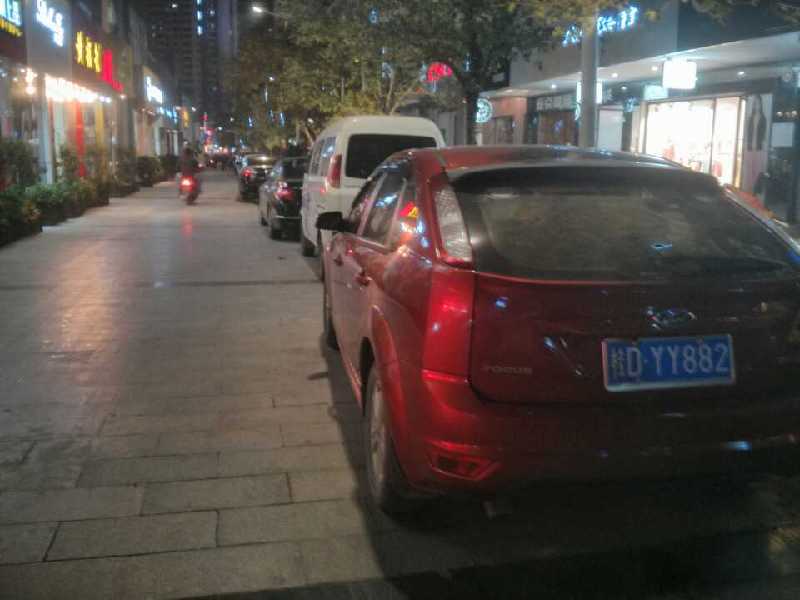 ????不管是白天(上圖)還是晚上(下圖),新界步行街南邊單行道的一側,都停滿了小車,影響了其他車輛和行人的通行。西江都市報記者 謝韻 楊苑君/攝