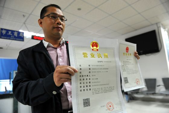 3月3日,在梧州市政務服務中心,梧州市中禧家電有限公司負責人拿到了登記制度改革后首批新版營業執照。新版營業執照正本和副本都采用豎向排版,并在執照正面增加了可掃描查詢登記企業信息的二維碼。 記者 何鎏/攝