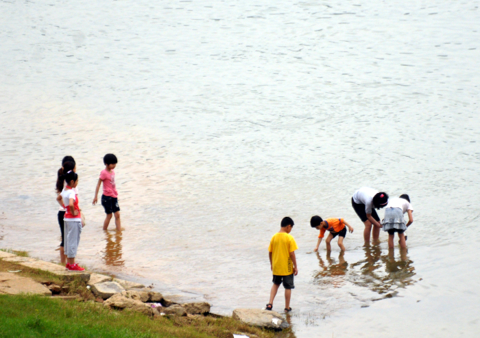 ????日前,一群小朋友聚集在梧州市河東防洪堤對出西江江邊淺水區戲水游玩。如今正值春汛,江水水位較高,小孩進入淺水區戲耍存在著安全隱患,家長應加強監管。 阿萌/攝