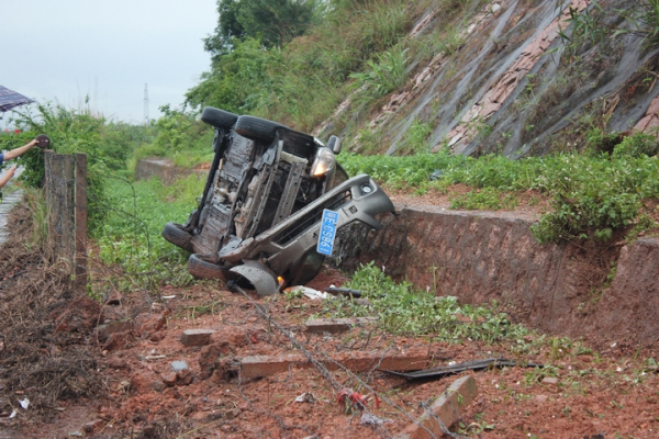 發(fā)生事故的車輛撞破高速公路旁的鐵絲網(wǎng),重重地摔在高速公路的邊坡上。