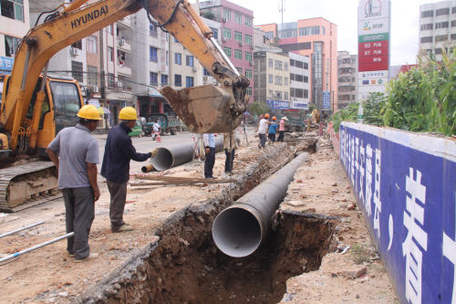 7月4日,在藤縣縣城河西片區(qū),工人們正鋪設(shè)自來(lái)水管。為保障群眾生活用水供應(yīng),該縣投入600多萬(wàn)元實(shí)施供水管道擴(kuò)建工程,在縣城河西片區(qū)增設(shè)一條1.8公里長(zhǎng)管道,與原有的自來(lái)水管道并聯(lián)供水。