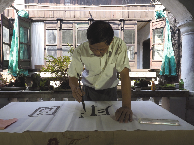 ????愛好書法的周振中為迎接中秋佳節即席揮毫。