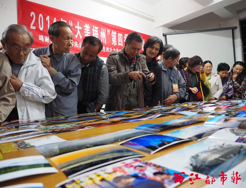 ??? 11月14日晚,攝影愛好者在梧州市攝影家協會舉辦的2014年“大美梧州”攝影比賽中觀摩參賽作品。