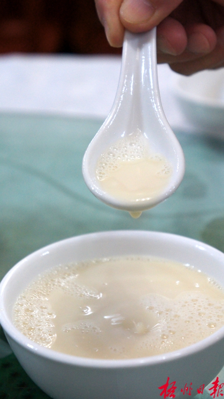 ????用湯匙舀起豆?jié){,滴落宛如一串?dāng)嗑€的珍珠,“滴珠豆?jié){”因此得名。香、滑、濃是食客對(duì)冰泉滴珠豆?jié){的一致贊美。同樣的制作原材料,為何獨(dú)梧州冰泉豆?jié){在全國(guó)闖出名氣?走到地下層生產(chǎn)間一一參觀,豁然開(kāi)朗。