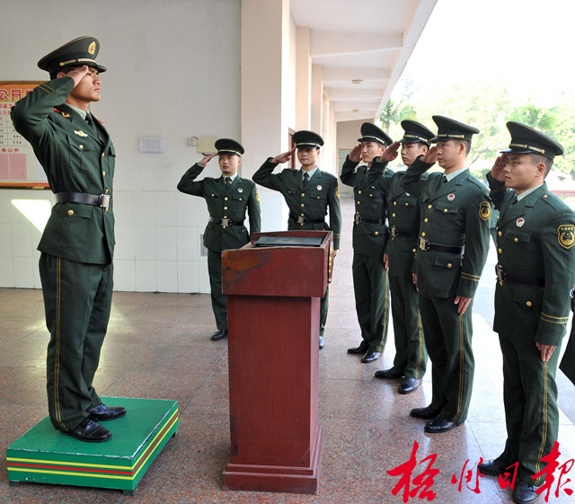 11月23日上午9時,根據武警梧州市支隊下達的命令,各中隊的留隊戰友為退伍老兵卸下帽徽、領花、肩章。
