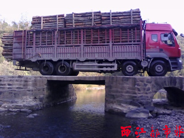 ????村民陸先生是留利村廣龍組的村民。他告訴記者,留利橋建于上世紀70年代,是一座老舊的漫水橋,高約2.5米,寬約5米。橋的頭、尾兩端均設置有“限重10噸”的標志牌。然而,從陸先生提供的現場照片可見,常有多輛滿載木材的重型車從留利橋上通行。陸先生說,這種重型車凈車重就已經超過10噸,如果再加上貨物,肯定遠超留利橋的限重標準。