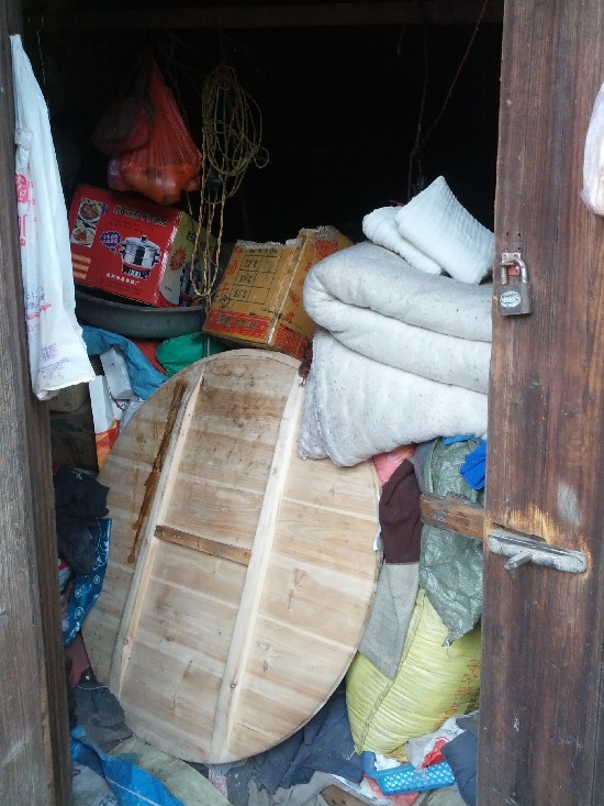 ????在梁壯妙的帶領下,記者來到了歐德福在新圩街的住所。那是一間黃泥磚砌成的瓦房,門前堆放著農(nóng)具、木材、衣褲、袋子以及一堆小包裝的洗浴液等雜物。當天上午,歐德福不在家,但大門沒有鎖,推開門后,記者看到屋里也是堆滿了棉被、食品、雜物等,走不進去,只留一個人的位置,剛好站得在大門左邊的房間門前,然而房間從里面上了鎖。