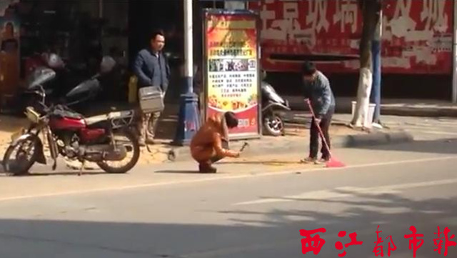 ????在這段長約48秒的視頻中記者看到,這名婦女對著道路上的停車黃線不斷錘擊。而在這名婦女旁邊,還有一名拿著掃帚的男子正在清掃地面,并不時將婦女錘下的黃色碎塊掃到一旁。記者觀察到,在這名婦女背后的人行道上,樹立著一塊寫著“政賢路”的指示牌。