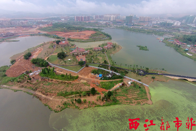 ??? 5月7日,從空中俯瞰建設當中的玫瑰湖湖心島。隨著建設的不斷推進,玫瑰湖湖心島上部分建筑已經完工,歐式的建筑風格配合典雅的園林景致,呈現出一片園林美景,成為了不少市民新的休閑去處。西江都市報記者 何鎏/攝