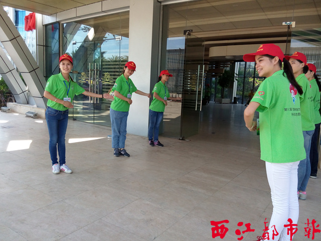 ????當(dāng)天已經(jīng)是禮儀組的第三天實(shí)地彩排了。禮儀組組長(zhǎng)、梧州學(xué)院大三學(xué)生毛羽說:“禮儀組的15名志愿者都來自學(xué)校禮儀隊(duì),能選上的禮儀志愿者必須具有‘三高’,即顏值高、身高、身體協(xié)調(diào)性高。雖然我們大部分人都具有禮儀經(jīng)驗(yàn),基本功扎實(shí),但開幕式當(dāng)天的流程較多,工作范圍大,所以我們提前三天進(jìn)行彩排。”