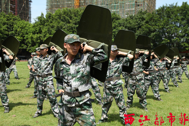 ????6月18日,萬秀區民兵應急連在操練警棍盾牌術。