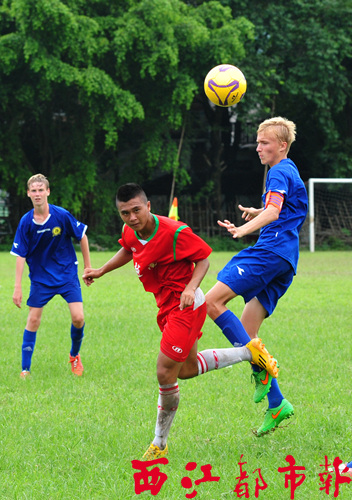 在U17年齡組的決賽中,雙方隊員在積極爭搶頭球。7月25日,2015年兩岸十地青少年足球邀請賽在梧州國家體訓基地圓滿落幕。經(jīng)過一個星期的激烈比拼,賽事決出了八個年齡段共十一個組別的冠軍。據(jù)悉,今年的兩岸十地青少年足球邀請賽,創(chuàng)下了全國青少年同類足球夏令營有史以來規(guī)模最大、參加人數(shù)最多、涉及面最廣的紀錄,同時,俄羅斯、馬來西亞、越南等國外球隊的加入,更為賽事增添了不少亮點。記者 陳健新 攝
