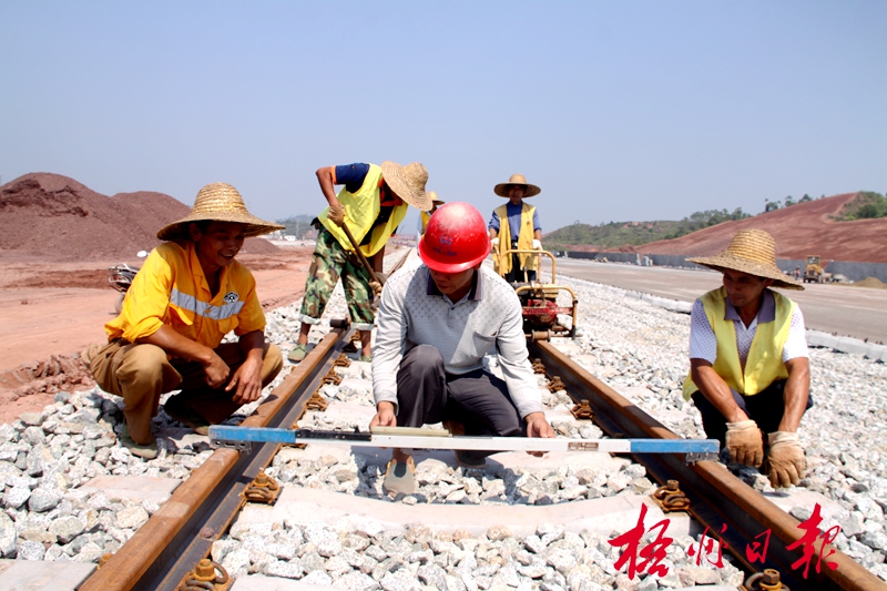 ??? 10月17日,在赤水鐵路專用線工地,技術人員對已鋪設的鐵軌進行正檢測。