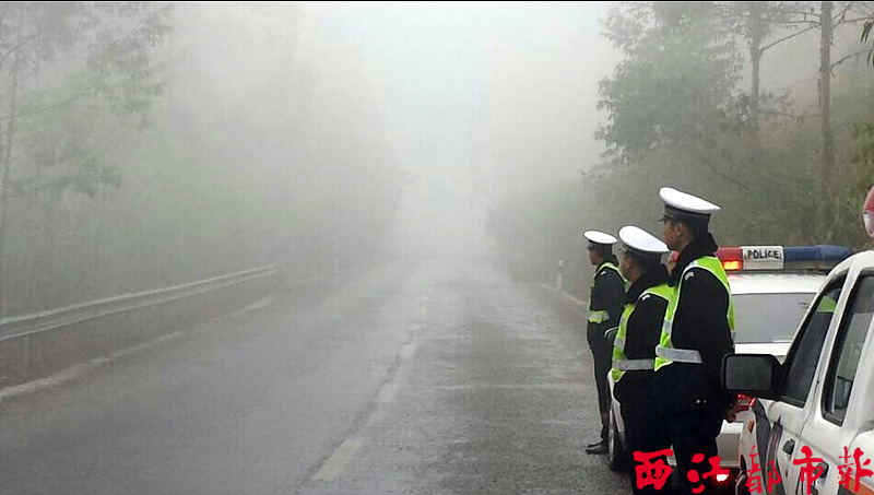 12月23日早上,207省道蒙山九步埃路段出現大霧,民警正在現場執勤。 (蒙山交警大隊供圖)