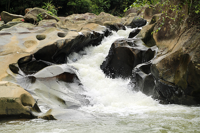 ????沿著河谷繼續逆流攀爬,就進入傳說中的連環潭。這河水,又如金剛鉆一般堅硬,在這塊石頭上鑿鑿,在那塊石頭上敲敲……千百年,河水鑿敲不止,硬是在陡峭的石頭河床上,不僅鑿出了一道河,還鑿出了若干個“潭”來。與巖石相擁的水潭,漩渦串串,有深亦有淺,出水口處是仿佛如萬仞懸崖,河水轟然而下。