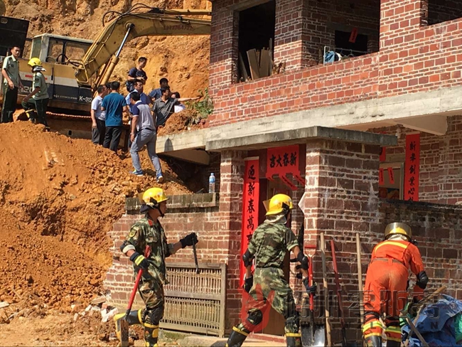 ????據梧州消防支隊負責人覃楚明介紹,今天上午消防隊員到達現場后第一時間劃出警戒線并進行搜救,在現場搜救發現,受災房屋一樓靠山邊房間的墻壁已被擊穿,其中一間房被泥土沒入大半,另一間房內三分之一空間也被泥土填充,消防人員只能用樹枝支撐剩余的墻體,預留救援空間,二樓房間也有部分泥土進入。