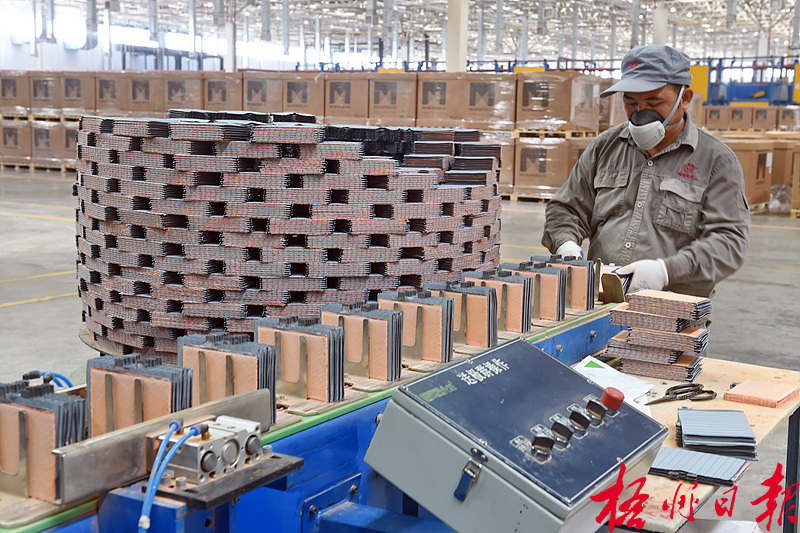 ????在駱駝集團(tuán)華南蓄電池有限公司車間,工人正生產(chǎn)鉛酸蓄電池。