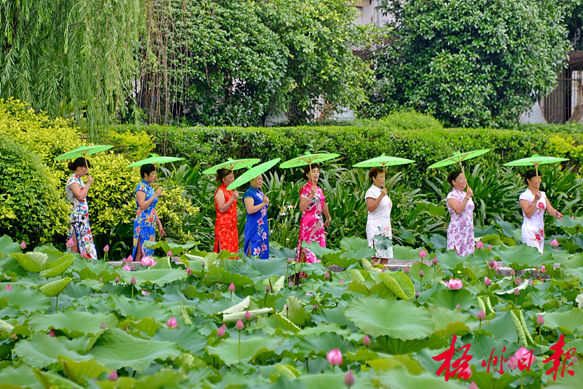 6月15日,一隊中年婦女在潘塘公園荷花池表演旗袍秀。最近,潘塘公園的荷花陸續綻放,吸引市民游客前來納涼休閑、觀賞荷花。 孟亞西 黃培成 攝