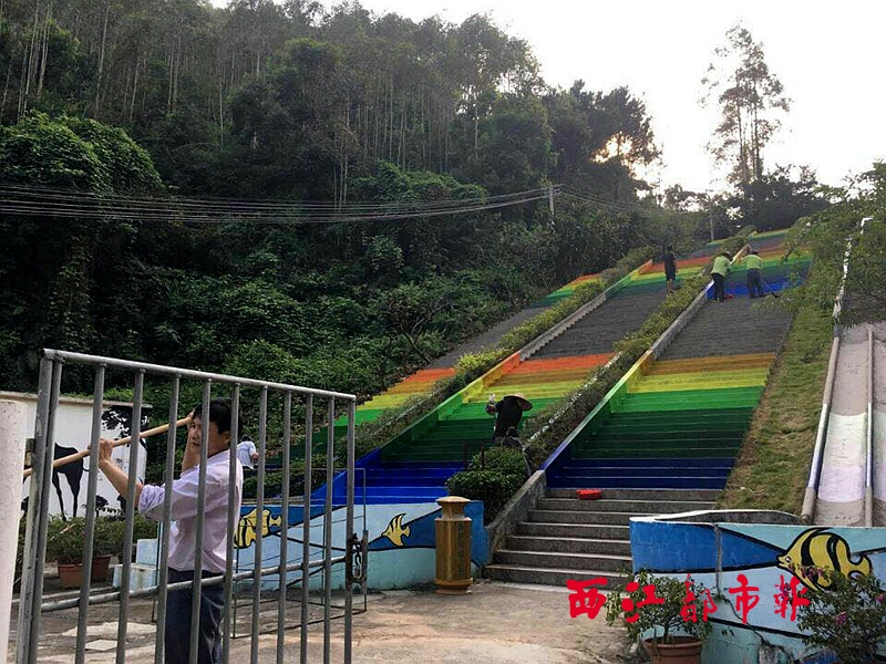 ??? 為迎接國(guó)慶節(jié),太和公園進(jìn)行了景觀提升改造工程。其中,通往太和公園動(dòng)物園二區(qū)的必經(jīng)之路百步級(jí),也在近期被工作人員粉刷上彩虹般的色彩,既增加了公園的亮點(diǎn),也激發(fā)了游客游覽的興趣。