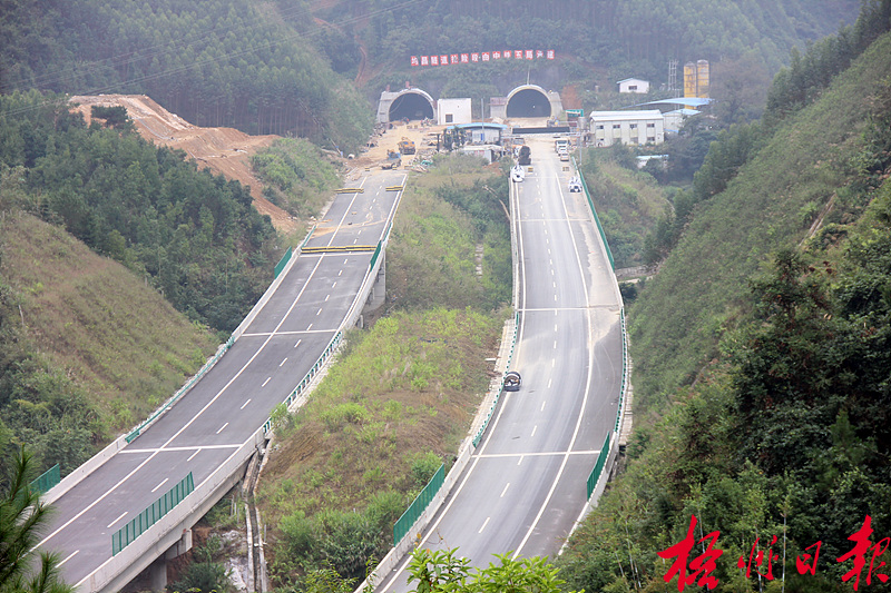 ????在包茂高速公路岑溪至水汶段的均昌隧道入口處,工程車輛來回穿梭(攝于11月20日)。