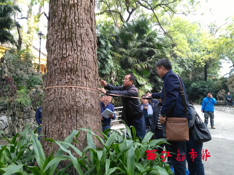 昨天,在梧州市珠山公園內(nèi),市園林部門(mén)的工作人員對(duì)古樹(shù)進(jìn)行測(cè)量普查。 西江都市報(bào)記者 吳艷虹 攝