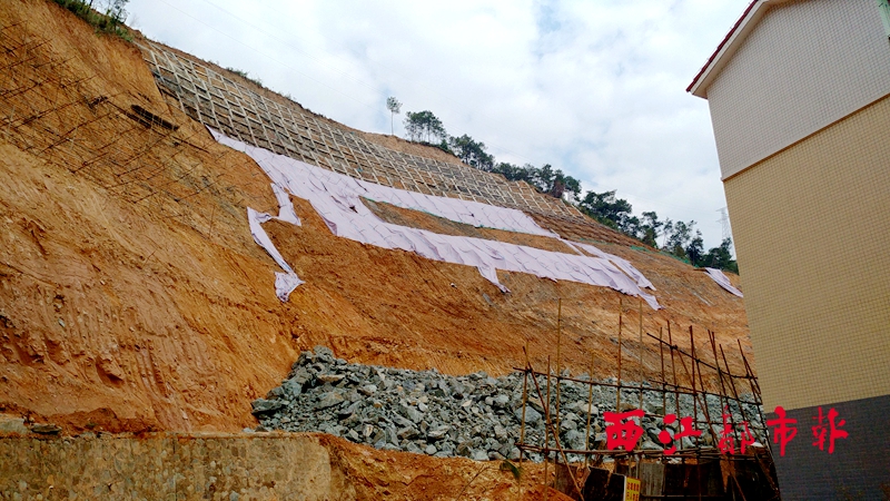 ??? 前不久,位于梧州市京梧山莊后面的將軍山地質(zhì)災(zāi)害治理工程施工區(qū)域發(fā)生滑坡險(xiǎn)情,后經(jīng)相關(guān)應(yīng)急搶險(xiǎn)處置,險(xiǎn)情得到初步控制。2月4日,記者在該地災(zāi)點(diǎn)看到,整治區(qū)域最上三級(jí)錨索格構(gòu)梁部分完成錨索張拉鎖緊達(dá)250根,形變區(qū)域及裂縫已使用塑料三色布覆蓋。