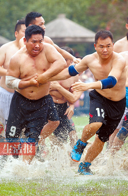尤其是搶花炮比賽,參賽隊(duì)員都是來自鄉(xiāng)鎮(zhèn)的農(nóng)民代表,個(gè)個(gè)赤膊上陣,展開激烈地較量。壯鄉(xiāng)搶花炮,素有東方橄欖球之稱,是壯族人民喜愛的傳統(tǒng)體育項(xiàng)目之一,因?qū)辜ち叶钍軌炎迦罕娤矏邸鹘y(tǒng)的“花炮”是一枚直徑約5厘米、用紅布纏繞的鐵環(huán)。比賽時(shí),“花炮”被放在裝滿火藥的發(fā)射器上,射向高空。待花炮落下時(shí),雙方隊(duì)員蜂擁而上,激烈拼搶。搶得花炮者在隊(duì)友的掩護(hù)下,沖破對(duì)方的搶奪和阻擋,奔向?qū)Ψ降呐谂_(tái),將花炮投入花籃中即得1分,得分多者為勝。 |