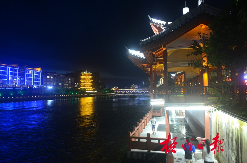在蒙山縣東江兩岸,亭臺(tái)樓閣、橋梁房屋在燈光的映照下璀璨奪目,兩岸夜景令人陶醉。