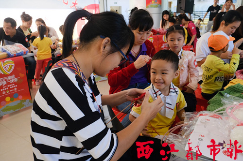 此外,活動現場的展臺上還擺放著多件編織好的愛心毛衣。家長張女士說:“能參與到這樣一個愛心活動中來,我很快樂!”張女士的女兒就讀于市蝶山教育實驗幼兒園,她從幼兒園了解到此次愛心活動后立即報名參加。張女士利用晚上和周末的空余時間編織毛衣,不到一個星期,就織好了一件精美的背心。