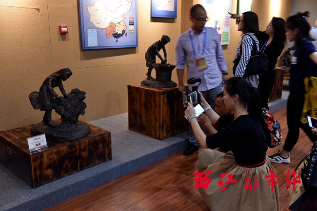 前來參觀的嘉賓和游客在拍攝采茶制茶工藝雕塑。西江都市報記者 何鎏 攝