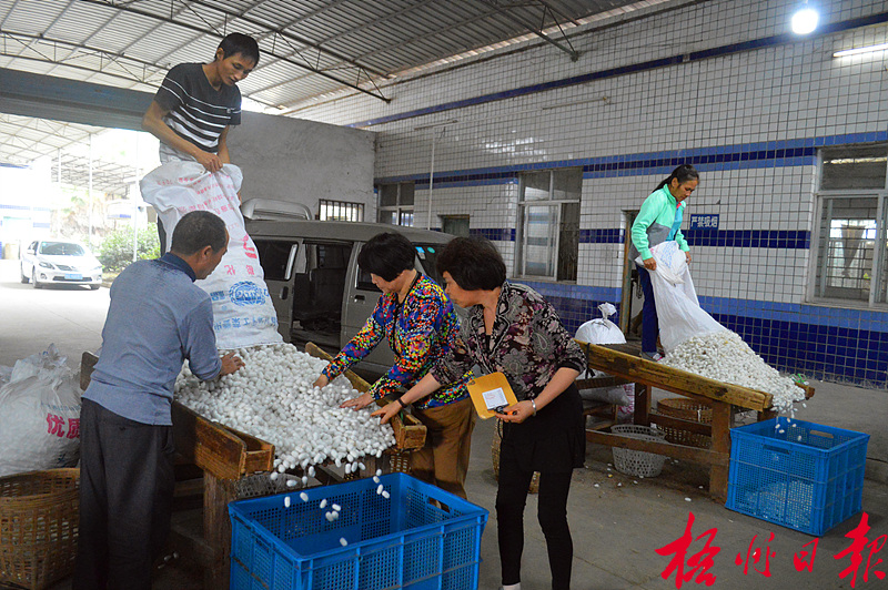 11月11日,蒙山縣蠶農在該縣華虹絲綢公司收購點出售今年最后一批蠶繭。