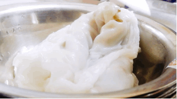 “一個會吃腸粉的人,他看師傅刮粉就知道米漿調得如何了:好的腸粉可以用鏟子直接鏟起來,然后不斷地折疊;而米漿調得太稀的話,粉皮根本鏟不起來,得用推的。”志哥一邊熟練地用鏟子把平攤的粉皮卷成了一條腸粉,一邊眉飛色舞地說道:“吃腸粉第一重點,就是:甘、滑、順。我們用純大米磨出來的米漿,它的顏色不會很白,里面必須還有一層淡黃色的米油,這樣的米漿做出的腸粉就會有很重的米味,才會有很順滑的口感,而且軟而不爛。”