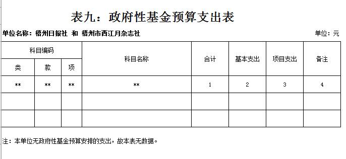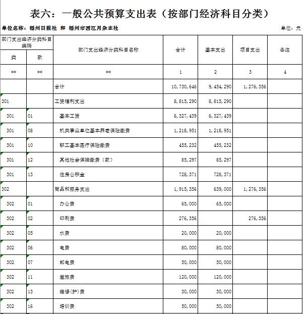 第一部分:部門概況 一、 基本情況(主要是工作職責(zé)) 梧州日?qǐng)?bào)社是梧州市委主管的新聞機(jī)構(gòu),負(fù)責(zé)宣傳黨的路線、方針、政策,傳播梧州市主流新聞和其他信息,大力弘揚(yáng)時(shí)代主旋律,圍繞市委市政府的中心工作,服務(wù)大局,反映人民群眾的心聲,為梧州政治經(jīng)濟(jì)社會(huì)文化發(fā)展?fàn)I造良好的輿論氛圍,促進(jìn)梧州地方社會(huì)經(jīng)濟(jì)文化發(fā)展。 負(fù)責(zé)出版《梧州日?qǐng)?bào)》和《西江都市報(bào)》,經(jīng)營(yíng)《梧州零距離網(wǎng)站》以及其他書報(bào)刊,從事相關(guān)印刷、發(fā)行、報(bào)紙廣告經(jīng)營(yíng)業(yè)務(wù)。分管西江月文藝雜志社,主管梧州日?qǐng)?bào)社印刷廠。 二、 機(jī)構(gòu)設(shè)置、編制現(xiàn)狀情況(包含基層預(yù)算單位組成、單位性質(zhì)) 根據(jù)規(guī)定,并結(jié)合本單位實(shí)際,我單位共有12個(gè)職能科室,即:黨委辦公室、總編辦公室、財(cái)務(wù)室、發(fā)行部、廣告部、采編中心、專刊中心、群工部、經(jīng)濟(jì)專刊部、新聞研究室、西江都市報(bào)、梧州零距離網(wǎng)站。共有2個(gè)下屬單位:西江月文藝雜志社(科級(jí)差額補(bǔ)助預(yù)算管理事業(yè)單位)和梧州日?qǐng)?bào)社印刷廠(副科級(jí)自收自支事業(yè)單位)。 三、 人員構(gòu)成情況(包含基層預(yù)算單位人員構(gòu)成、經(jīng)費(fèi)管理方式) 梧州日?qǐng)?bào)社截至2019年1月末,在職職工170人,其中:梧州日?qǐng)?bào)社事業(yè)編制人員70人(正處干部 2人,副處干部 5人,正科級(jí)干部5人,副科級(jí)干部11人,事業(yè)人員47人);西江月文藝雜志社事業(yè)編制人員3人;梧州日?qǐng)?bào)社印刷廠事業(yè)編制人員24人。編外聘用73人(未含投遞、臨時(shí)廣告人員)。 梧州日?qǐng)?bào)社截至2019年1月末,實(shí)有退休職工72人,其中:梧州日?qǐng)?bào)社事業(yè)編制退休人員40人,梧州日?qǐng)?bào)社印刷廠事業(yè)編制退休人員26人,西江月文藝雜志社事業(yè)編制退休人員6人。 梧州日?qǐng)?bào)社的經(jīng)費(fèi)管理方式屬于差額預(yù)算管理事業(yè)單位,梧州日?qǐng)?bào)社印刷廠屬于自收自支管理事業(yè)單位,西江月文藝雜志社屬于差額預(yù)算管理事業(yè)。 四、 年度主要工作任務(wù) 梧州日?qǐng)?bào)社負(fù)責(zé)出版《梧州日?qǐng)?bào)》和《西江都市報(bào)》,經(jīng)營(yíng)梧州零距離網(wǎng)站以及其他書報(bào)刊,從事相關(guān)印刷、發(fā)行、報(bào)紙廣告經(jīng)營(yíng)業(yè)務(wù)。西江月文藝雜志社負(fù)責(zé)出版《西江月》雜志。 第二部分: 2019年部門預(yù)算報(bào)表(預(yù)算公開報(bào)表作為附件掛在報(bào)告尾部,詳見附件) 第三部分:2019年部門預(yù)算及“三公”經(jīng)費(fèi)預(yù)算報(bào)表說明 一、2019年部門收支總體預(yù)算情況 (一)收入預(yù)算說明。 2019年收入總預(yù)算10,730,646元,同比減少739,400元,下降6.45%。2019年收入預(yù)算總體減少的主要原因:財(cái)政項(xiàng)目經(jīng)費(fèi)撥款預(yù)算減少,使收入預(yù)算總體有所減少。 其中: 1、一般公共預(yù)算撥款10,730,646元,同比減少739,400元,下降6.45% ,經(jīng)費(fèi)撥款(補(bǔ)助)10,730,646元,主要是人員支出、社會(huì)保障和項(xiàng)目收入等。 2、本單位無(wú)政府性基金撥款收入,同比無(wú)增減變化。 3、本單位無(wú)納入財(cái)政專戶管理的事業(yè)收入,同比無(wú)增減變化。 4、本單位無(wú)轉(zhuǎn)移性收入,同比無(wú)增減變化。 5、上年結(jié)余收入0元,同比無(wú)增減變化。 (二)支出預(yù)算說明。 2019年支出總預(yù)算10,730,646元,同比減少739,400元,下降6.45%;支出減少的主要原因:項(xiàng)目經(jīng)費(fèi)撥款預(yù)算減少,使支出預(yù)算總體減少。 其中: 按支出功能分類科目劃分。 (1)文化旅游體育與傳媒支出8,321,702元,占支出總預(yù)算76.58%,同比減少1,317,205元,下降13.67%。(2)社會(huì)保障就業(yè)支出1,218,951元,占支出總預(yù)算11.36%,同比增加295,301元,增長(zhǎng)31.97%。(3)衛(wèi)生健康支出461,622元,占支出總預(yù)算4.30%,同比增加108,323元,增長(zhǎng)30.66%。(4)住房保障支出728,371元,占支出總預(yù)算 6.79%,同比增加174,181元,增長(zhǎng)31.43%。 按支出結(jié)構(gòu)分類劃分,分為基本支出預(yù)算和項(xiàng)目支出預(yù)算。 基本支出9,454,290元,占支出總預(yù)算88.11%,同比增加2,316,129元,增長(zhǎng)32.45%。 項(xiàng)目支出1,276,356元,占支出總預(yù)算11.89%,同比減少3,055,529元,降低70.53%。 二、2019年部門財(cái)政撥款收支預(yù)算情況 (一)財(cái)政撥款收入總體情況。 2019年財(cái)政撥款收入10,730,646元,同比減少739,400元,下降6.5%。2019年收入預(yù)算總體減少的主要原因:財(cái)政項(xiàng)目經(jīng)費(fèi)撥款預(yù)算減少,使收入預(yù)算總體有所減少。 其中: 1、一般公共預(yù)算撥款10,730,646元,同比減少739,400元,下降6.5%。經(jīng)費(fèi)撥款10,730,646元,主要是人員支出和項(xiàng)目收入。 2、政府性基金預(yù)算撥款0元,同比無(wú)增減變化。 3、上年結(jié)余收入0元,同比無(wú)增減變化。 (二)財(cái)政撥款支出總體情況。 2019年財(cái)政撥款支出10,730,646元,同比減少739,400元,下降6.5%。支出減少的主要原因:項(xiàng)目經(jīng)費(fèi)撥款預(yù)算減少,使