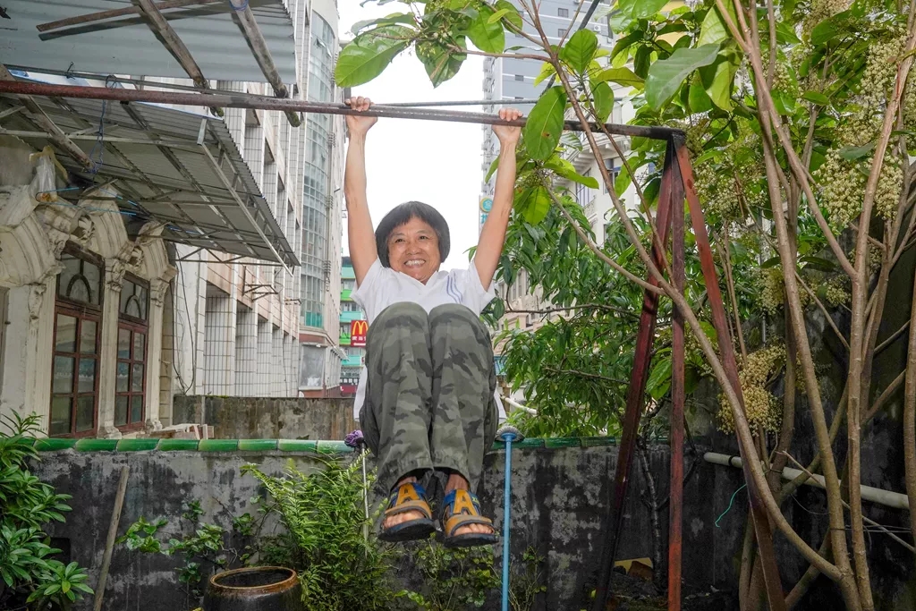 瓊姨在陽臺的單杠上鍛煉身體,她笑言騎樓城的這個陽臺是對她的一種恩賜。