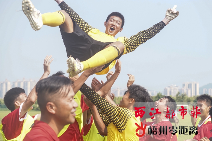 乙組決賽中,獲得勝利的梧州市隊隊員忘情慶祝,拋起在點球大戰中撲出兩個點球的門將。 記者 楊揚 攝 而在當天進行的甲組的決賽中,北海市隊奪得該組別的冠軍。 據悉,本次賽事也是今年區運會足球比賽的資格選拔賽,奪冠的梧州市隊、北海市隊將作為各自組別的種子隊伍參加區運會的比賽。 梧州市隊主教練黃翊表示,這是梧州市近20年來首次在全區級別的專業足球賽中奪冠,接下來他們將會繼續集訓,積極備戰今年的廣西區運會。 |