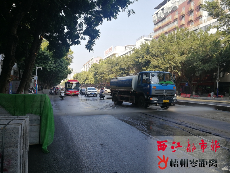 梧州零距離網-西江都市報訊(記者 吳艷虹)近期,市內多條主干道的道路改造提升工程正在有序展開,但有讀者向本報反映,稱部分路段在進行工程作業時產生揚塵,加之近來天氣干燥,揚起的灰塵四處飄散。對此,環衛部門與道路改造提升工程建設單位均表示,已采取對路面進行不間斷灑水等措施降低揚塵。 讀者劉女士反映,她居住在新興市場旁,新興一、二路是上下班的必經道路。“有時候路過施工路段時,能看到施工作業產生較大的揚塵,特別是切割磚塊的時候。”劉女士說道。 12月12日,記者沿新興一、二路走訪,發現整條道路內有多個作業面正同時開展施工。記者觀察發現,沿路雖然有施工人員正在進行磚塊切割、地磚鋪設、搗制水泥、綠化帶施工等作業,但產生的揚塵很少,且期間有灑水車密集地來回灑水,使路面保持濕潤狀態。而在工廠路小學門前,路邊還擺放著一輛環保降塵霧炮機。