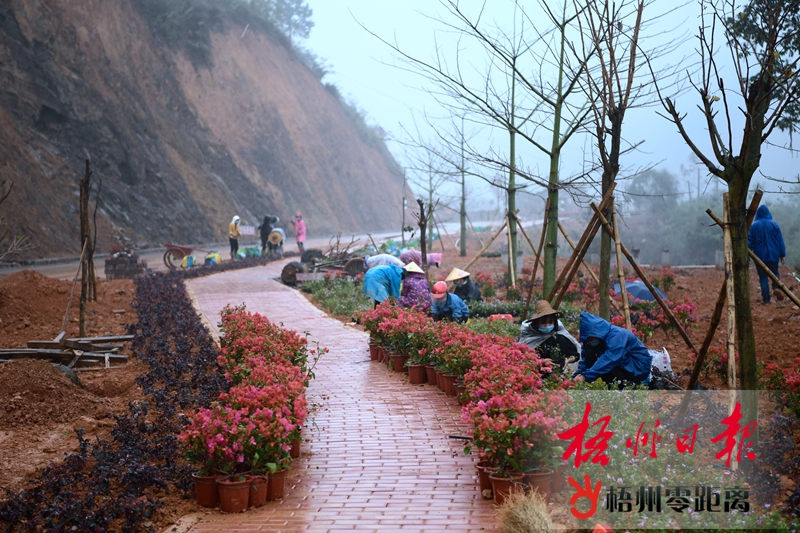 3月17日,工作人員在進入蒼梧縣六堡鎮道路旁的綠化帶上種植綠化景觀植物。目前,355國道六堡延長線景觀帶項目正在加緊施工建設,建成后,將使六堡小鎮的景觀更加漂亮。 記者 蒙紹松 攝