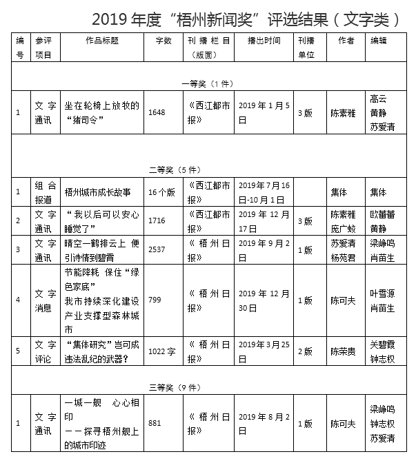 2019年度梧州新聞獎(梧州日報社部分)經(jīng)過評委們的認真評選,現(xiàn)評選出30件擬獲獎作品,其中一等獎5件,二等獎8件,三等獎17件。 現(xiàn)予以公示,時間為3月30日至4月3日。在此期間,社會各界均可通過電話、信函、電子郵件等方式對評選結(jié)果發(fā)表意見,進行監(jiān)督和評議。 監(jiān)督電話:0774-6021176 電子郵箱:wzxcbxck@126.com 郵寄地址:梧州市長洲區(qū)迎賓路19號,郵編:543002 附件:2019年度“梧州新聞獎”評選結(jié)果 梧州市新聞工作者協(xié)會 梧州市新聞學(xué)會 2020年3月30日