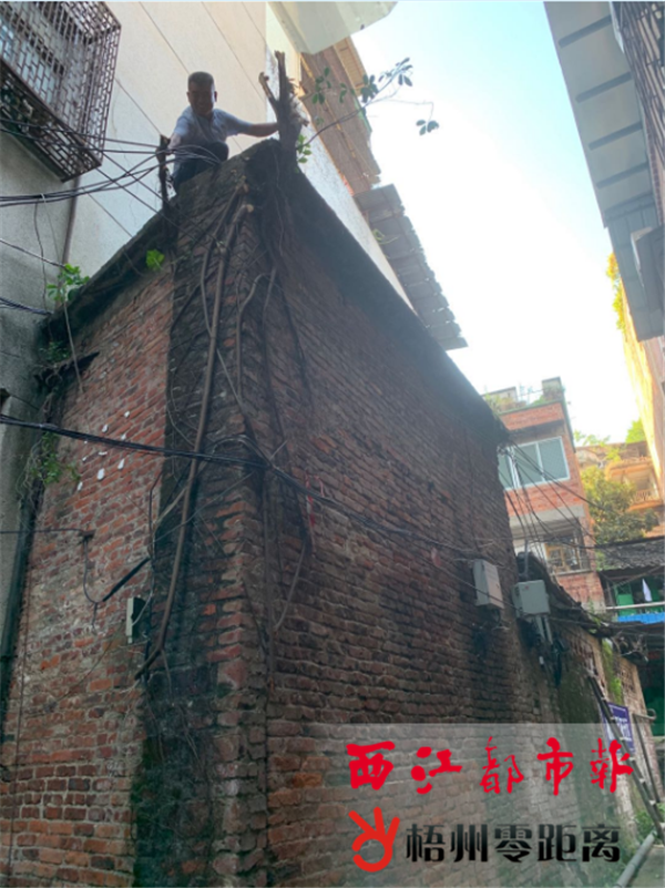 梧州零距離網-西江都市報訊(記者 陳雨燕 實習生 伍葉娟)在云蓋路南三巷其中一段不到十米的巷道里,居民出入要經過一塊有傾斜掉落危險的廣告牌,以及一棵攀附舊磚墻而生的榕樹。“這條巷道是我們周邊居民出入的必經之路,大家很擔心廣告牌會掉落,也擔憂舊墻因支撐不了榕樹的重量而倒塌。”7月22日,家住云蓋路的居民李女士向本報反映上述情況,希望職能部門能幫助居民解決相關安全隱患。 居民經過小心翼翼 7月23日上午,記者來到云蓋路南三巷走訪發現,榕樹攀附的舊墻是巷道旁邊一家廠房的外墻。據附近居民介紹,五六年前,墻上長了一棵小樹苗,當時大家都沒有太在意,如今,這棵榕樹越長越大,攀墻而上。記者看到,榕樹茂盛的樹冠“騎”在了磚墻頂部,多條樹根扎進磚墻的縫隙里,把磚墻的縫隙撐大,最大的一條裂縫已有手指寬。在距離這棵榕樹五六米的地方,有一塊年久失修的廣告牌。廣告牌已經發生傾斜,底部支撐物布滿鐵銹。