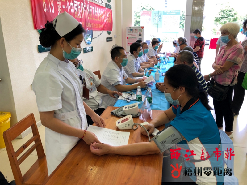梧州零距離網-西江都市報訊(記者 謝韻 通訊員 黃舒捷 陳思晴)今年8月19日是第三個中國醫(yī)師節(jié)。為大力弘揚“敬佑生命、救死扶傷、甘于奉獻、大愛無疆”的崇高精神,當天上午,市人民醫(yī)院、市工人醫(yī)院、市中心血站等醫(yī)療機構到社區(qū)開展了義診活動。 上午9時許,在大塘街道社區(qū)衛(wèi)生服務中心一層,來自市人民醫(yī)院的專家醫(yī)生用桌子拼成臨時的診臺,以一對一的方式,或為市民量血壓,或針對大家的疑問答疑解惑(下圖,謝韻攝)。自2017年國家設立中國醫(yī)師節(jié)后,該院每年都會在中國醫(yī)師節(jié)當天到街道社區(qū)開展義診服務。市人民醫(yī)院副院長姜洪表示,中國醫(yī)師節(jié)的設立,是社會對醫(yī)務工作者辛勤付出的肯定,在促進醫(yī)生與群眾交流、增進群眾對醫(yī)生的了解等方面也有積極作用。因此,在這個節(jié)日里,醫(yī)務工作者更應用心為群眾服務,回饋社會。