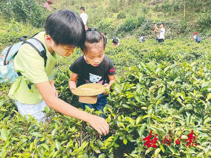 10月5日,梧州日報社小記者在蒼梧縣六堡鎮四柳村的茶山采茶。 10月5日和6日,梧州日報社分別組織了一個“我是六堡茶‘小博士’”研學團,到蒼梧縣六堡鎮開展研學活動。活動中,小記者及其親屬通過到茶山參觀,聽六堡茶制作技藝非遺傳承人介紹,體驗采茶和炒茶技藝,學習制作農家美食,以及聽瑤鄉群眾唱山歌等方式,深入了解六堡茶文化和六堡鎮的風土人情。