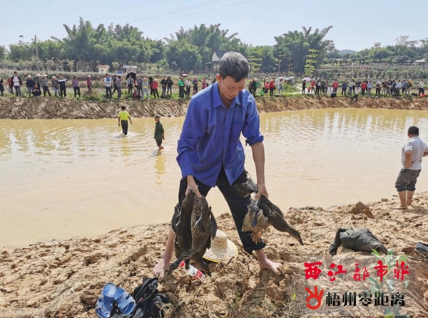 當天上午,精彩的舞獅表演拉開了活動序幕,活動現場分為主會場、趣味活動區、農特優產品美食展銷區等三個主要區域。其中,農特優產品展銷區展示了30多種當地的農產品,游客們一邊向農戶了解產品情況一邊選擇購買。 除了農產品展示,活動主辦方還設置了搖擺橋、猜謎等活動項目,其中最讓游客有參與感的就是摸魚抓鴨游戲。主辦方當天投放了2000多斤鯇魚和100多只鴨子在池塘里,讓游客自由擒抓,并免費帶走。結果,游客們紛紛挽起褲腳走進池塘擒抓自己看中的目標,場面非常熱鬧。 |