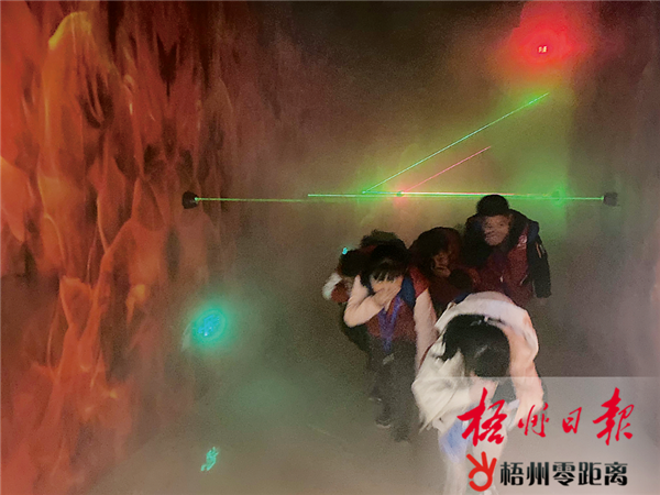一條長長的模擬火災逃生通道吸引了大家的注意,通道以紅色、綠色的燈模擬火,以水蒸氣模擬火災發生的濃濃煙霧。“當我們需要穿過濃煙逃生時,首先我們要用濕毛巾或者濕衣物捂住口鼻,身上披著濕的衣物或被褥,并要盡量使身體貼近地面向安全方向爬行。”梁獻助說。小記者們聽取了工作人員介紹,親身體驗了穿越濃煙滾滾的火災逃生通道演練,掌握了火災發生時正確的逃生流程。