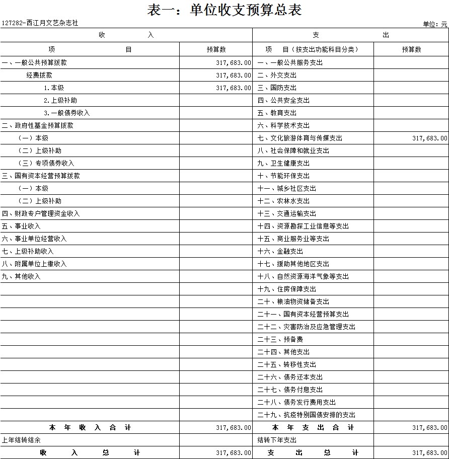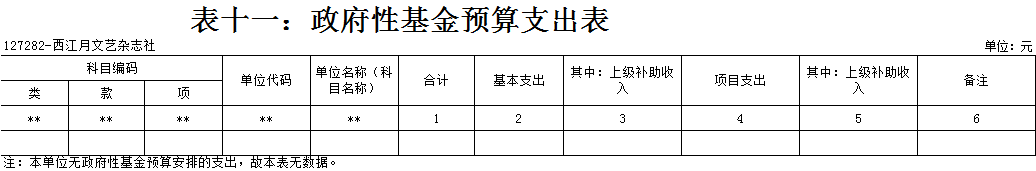 西江月文藝雜志社2021年 單位預算及“三公”經費預算情況說明 目錄 第一部分:西江月文藝雜志社概況 一、主要職能 二、機構設置情況 三、人員構成情況 第二部分:西江月文藝雜志社單位預算及“三公”經費預算情況說明 一、單位收支預算總體預算情況說明 二、單位收入總體預算情況說明 三、單位支出總體預算情況說明 四、財政撥款收支預算情況說明 五、一般公共預算支出情況說明 六、一般公共預算基本支出情況說明 七、一般公共預算安排的“三公”經費情況說明 八、政府性基金預算情況說明 九、2021年單位預算其他事項說明 第三部分:專業名詞解釋 第四部分:西江月文藝雜志社2021年單位預算報表(詳見附件) 一、單位收支預算總表 二、單位收入預算總表 三、單位支出預算總表(按功能科目分類) 四、單位支出預算總表(按部門經濟科目分類) 五、財政撥款收支總表 六、一般公共預算支出表(按功能科目分類) 七、一般公共預算支出表(按部門經濟科目分類) 八、一般公共預算支出表(按政府經濟科目分類) 九、一般公共預算基本支出表(按部門經濟科目分類) 十、一般公共預算基本支出表(按項目類別) 十一、政府性基金預算支出表 十二、“三公”經費支出表 十三、國有資本經營預算支出表 第一部分:單位概況 一、主要職能 出版文藝雜志,促進文藝發展。《西江月》雜志出版發行。 二、機構設置情況 西江月文藝雜志社屬于差額事業單位,內設一個職能科室,編輯部。 三、人員構成情況 西江月文藝雜志社人員編制總數10名,其中:差額事業編制10名。其中,在職在編人員3人,包括:行政在職在編人員2人,后勤人員1人。離退休人員6人。 第二部分:西江月文藝雜志社2021年單位預算及“三公”經費預算情況說明 一、單位收支預算總體預算情況說明 2021年收支總預算317683元,同比無增長變化。收入包括:一般公共預算撥款;支出包括:文化旅游體育與傳媒支出。 2021年收支預算總體無增減。 二、單位收入總體預算情況說明 2021年收入總預算317683元,同比增加0元,增長0%。其中: (一)一般公共預算撥款(含上級補助,下同)317683元,占收入總預算的100%,同比無變化。 (二)本單位無政府性基金預算收入,同比無變化。 (三)本單位無財政專戶管理資金資金收入,同比無變化。 (四)本單位無事業收入,同比無變化。 (五)本單位無事業單位經營收入,同比無變化。 三、單位支出總體預算情況說明 2021年支出總預算317683元,其中,基本支出預算257683元,占支出總預算的81.12%,同比無變化;項目支出預算60000元,占支出總預算的18.88%,同比無變化。其中: (一)文化旅游體育與傳媒支出類科目317683元,占支出總預算100%,同比無變化。 四、財政撥款收支預算情況說明 2021年財政撥款收支總預算317683元。收入包括:一般公共預算撥款317683元;支出包括:文化旅游體育與傳媒支出317683元。 五、一般公共預算支出情況說明 2021年一般公共預算撥款支出317683元,其中:基本支出257683元,項目支出60000元,具體支出預算如下: (一)一般公共預算支出按支出功能分類科目劃分。 出版發行317683元,其中:基本支出257683元,項目支出60000元。主要用于出版文藝雜志,促進文藝發展。《西江月》雜志出版發行。 (二)按支出結構分類劃分,分為基本支出預算和項目支出預算。 1.基本支出預算257683元,占支出總預算的81.12%,同比無變化。其中: 工資福利支出預算257683元,占基本支出預算100%,同比無變化。 2.項目支出60000元,占支出總預算的18.88%,同比無變化。其中: 商品和服務支出預算60000元,占項目支出預算100%,同比無變化。 六、一般公共預算基本支出情況說明 2021年一般公共預算基本支出257683元,其中: 人員經費257683元,主要包括:基本工資。 公用經費0元。 七、一般公共預算安排的“三公”經費情況說明 (一)2021年部門預算全口徑安排的“三公”經費預算情況。 2021年部門預算全口徑安排“三公”經費支出預算0元,同比無變化。 其中: 1.因公出國(境)經費支出預算0元,同比無變化。 2.公務接待費支出預算0元,同比無變化。 3.公務用車費預算0元,同比無變化。 其中: (1)公務用車運行維護費支出預算0元,同比無變化。 (2)公務用車購置費0元,同比無變化。 (二)2021年一般公共預算資金安排的“三公”經費預算情況。 2021年一般公共預算安排的“三公”經費支出預算0元,同比無變化。其中:本級經費撥款預算0元,同比無變化。具體是: 1.因公出國(境)經費支出預算0元,根據財政局統一要求,各單位一般公共預算安排的因公出國(境)費不編入部門預算,執行中根據外事管理部門批準的年度出國計劃申請調整支出。 2.公務接待費預算0元,同比無變化。其中:本級經費撥款預算0元,同比無變化。 3.公務用車費預算0元,同比無變化。其中:本級經費撥款預算0元,同比無變化。 具體是: (1)公務用車運行維護費預算0元,同比無變化。其中:本級經費撥款預算0元,同比無變化。 (2)公務用車購置預算0元,同比無變化。其中:本級經費撥款預算0元,同比無變化。 八、政府性基金預算情況說明 2021年本單位無政府性基金收支業務,因此沒有相應的政府性基金收支預算。 九、2021年單位預算其他事項說明 (一)機關運行經費預算安排情況。 單位機關行政運行經費財政撥款預算0元,單位出版發行安排317683元,同比無變化。其中:基本支出257683元;項目支出60000元。包
