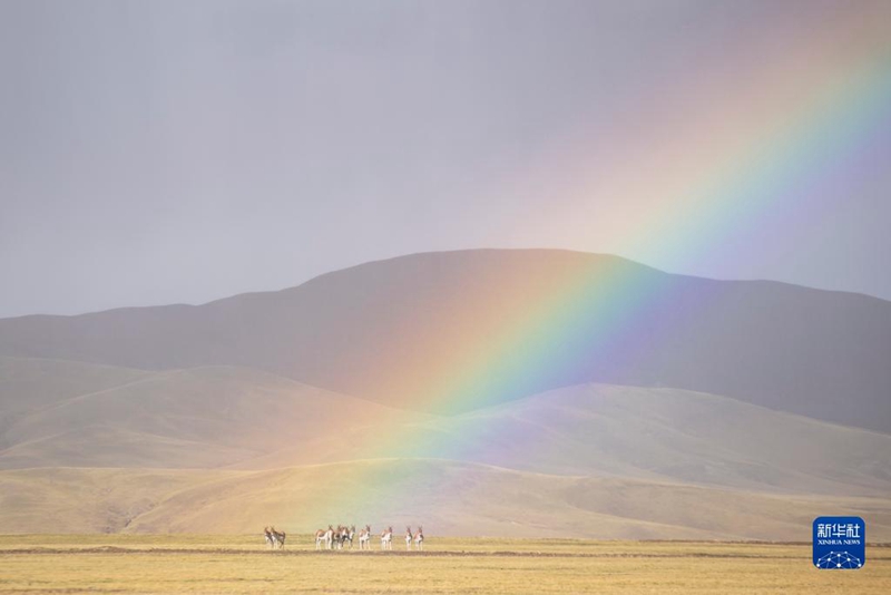 這是在羌塘國(guó)家級(jí)自然保護(hù)區(qū)拍攝的彩虹之下的藏野驢(2021年9月22日攝)。新華社記者 孫瑞博 攝