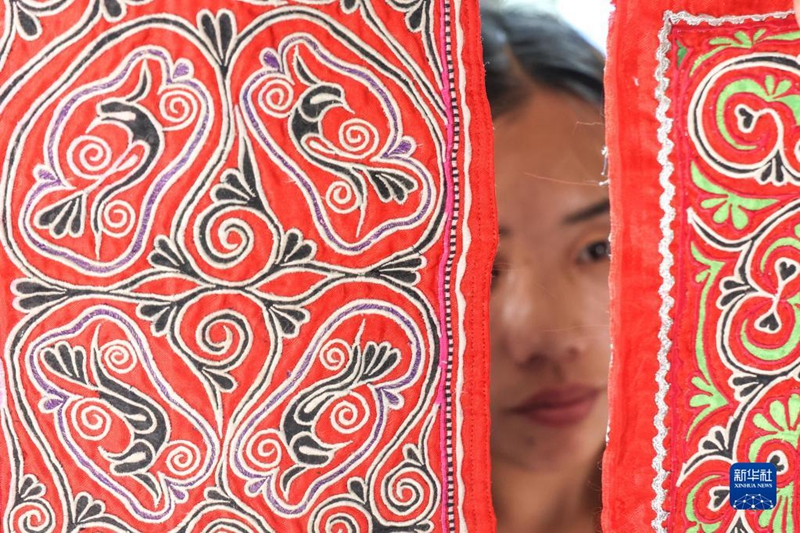 村民在貴州省黔西市新仁苗族鄉(xiāng)化屋村刺繡車間內(nèi)查看苗繡成品(2022年6月1日攝)。新華社記者 歐東衢 攝